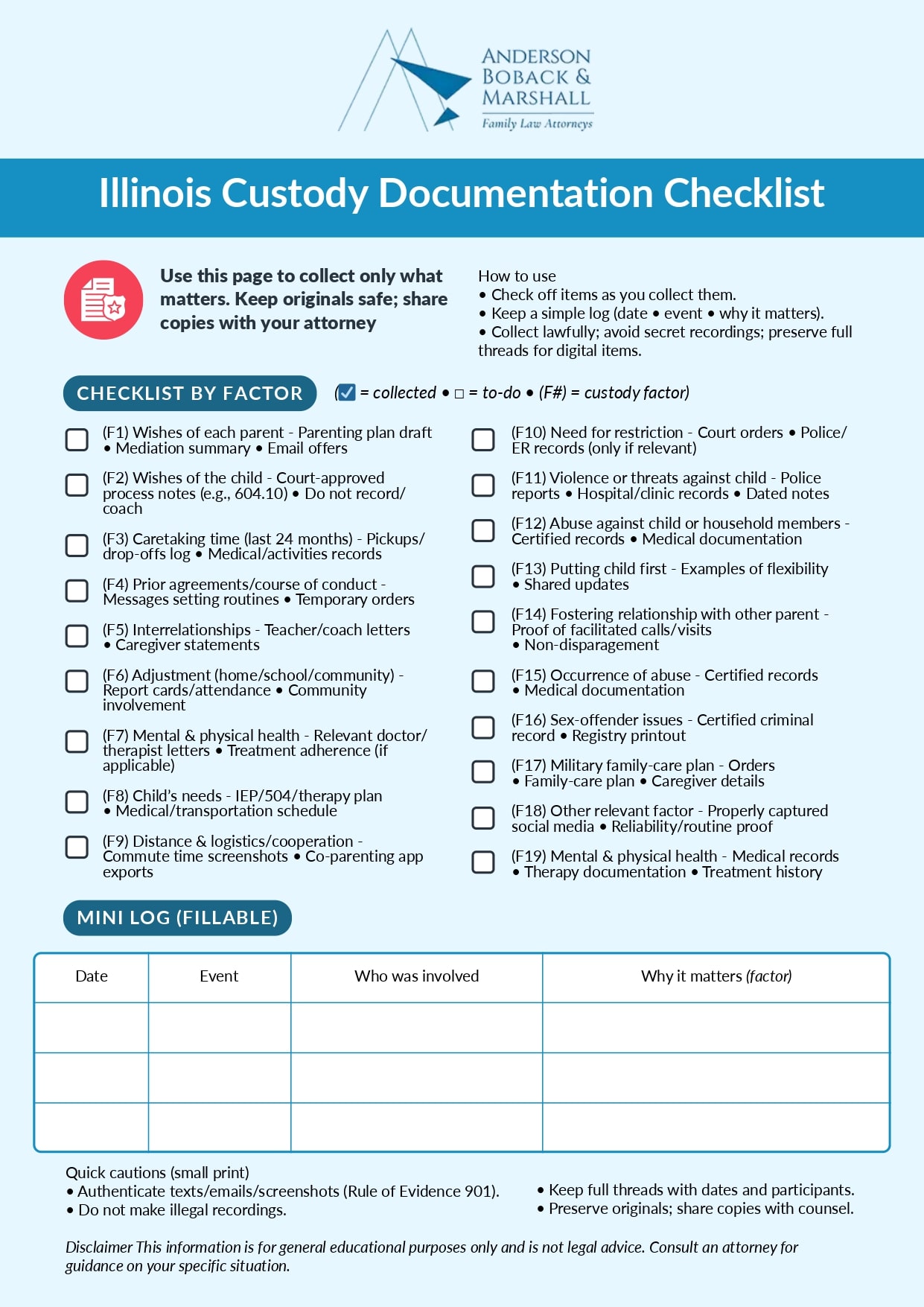 If you’re preparing for an Illinois custody case (allocation of parental responsibilities and parenting time), your documents tell the court what day-to-day life looks like for your child. This Illinois custody documentation checklist maps directly to the “best interests” factors in 750 ILCS 5/602.7 so you gather what matters and gather it lawfully. Inside, you’ll find a factor-by-factor list of evidence to collect, simple ways to organize files the court can trust, and common mistakes to avoid.